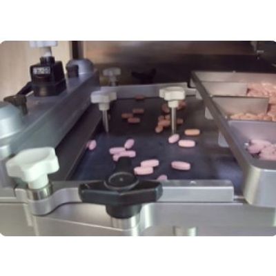 The Sypro linear bulk product conveyer with breakage elimination consists of two consecutive conveyers. The first serves to provide the second conveyer with a constant, single-layered tablet flow. In the second vibratory linear conveyer the products run evenly distributed over a perforated plate where most of the breakage fragments are eliminated before they reach the Sypro format tray.