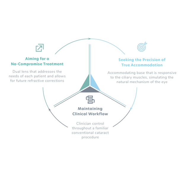 Designed for true accommodation, aiming to restore the full range of vision. Current treatment options have limitations with visual side effects: glares, halos and artifacts. Currently no solution mimics the natural ability of the eye to provide a full range of vision, from distance to near.