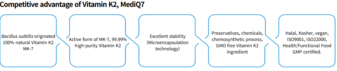 The only vitamin K2 producer in Korea Exclusive supply to global top 2 health-care companies.