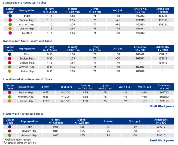Vitrex Micro Haematocrit Tubes are quality products, that conform to international standard ISO 12772. The tubes are firepolished at the colour-coded end to reduce waer on the centrifuge seals. We recommend the colour-coded end to be sealed with Vitrex Wax plate. The colour-coding on the tubes and packaging indicates the impregnation of the tube: plain (blue colour), sodium heparin (red colour), ammonium heparin (green colour) and lithium heparin (orange colour). Each heparinised tube contains at least 4-7 IU heparin as prescribed by the standard. Vitrex Micro Haematocrit tubes are also available in plastic with plain, sodium or ammonium heparin in a volume of ~75 μl. The plastic tube provides the same effect as the glass tube, but the possibility of contamination with the plastic tube is reduced due to breakage with no compromise in accuracy.
