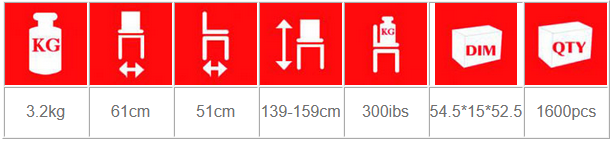 Aluminum frame. Double cross brace. Foam hanles. Two button folding mechansim. Rubber tips. Height adjustable. CKD with compact size. 5”front castors.