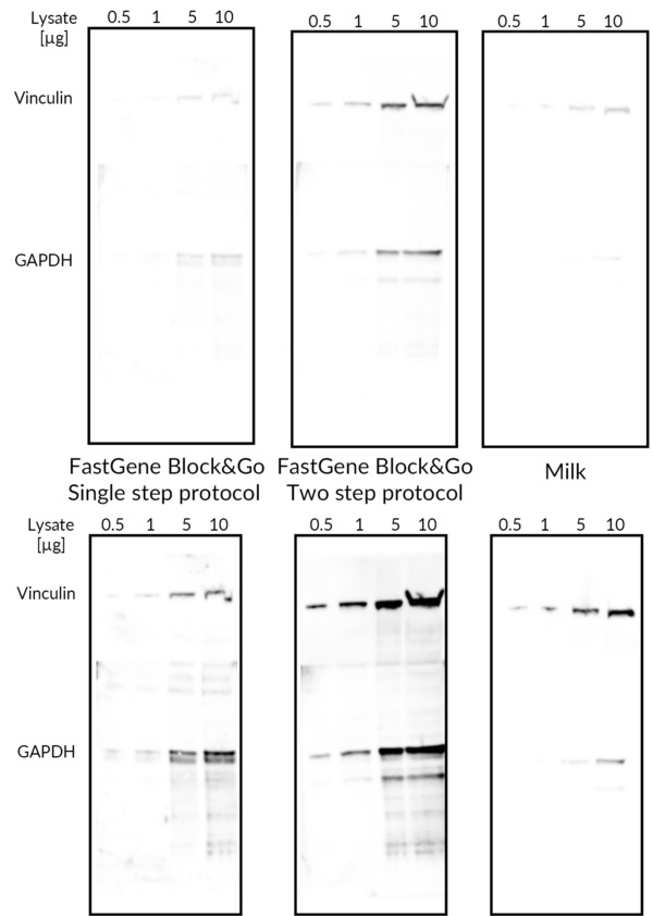 FastGene® Block & Go serves a blocking solution as well as signal enhancer in Western blot analysis. It provides blocking and primary and secondary antibody hybridization in one step. Furthermore, it enhances the signal developed with HRP (horseradish peroxidase) or AP (alkaline phosphatase) substrates. FastGene® Block & Go reduces time and labor-intensive Western bot procedure.
