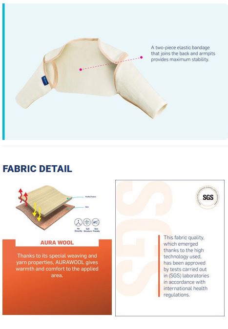 It is a double-sided shoulder bandage made of wool fabric (Aurawool) designed according to the anatomical structure. Provides support and protection to the shoulder, upper arm, neck and back against the cold.