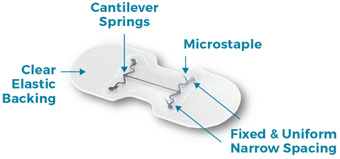 microMend contains a metal array of tiny Microstaples. They are fixed with narrow and uniform spacing from one another and provide tight skin closure and consistent results. The Microstaple array also contains cantilever springs, which provides device flexibility and elasticity to enable microMend to move with the skin. Novel engineering creates a product that is comfortable to wear without skin irritation. The elastic backing enables microMend to be applied like a bandage.
