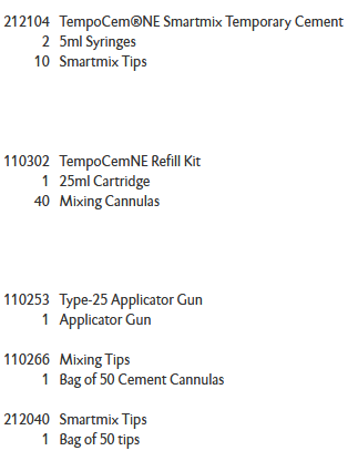 TempoCemNE zinc oxide non-eugenol cement is ideal for use in cases where a eugenol temporary cement is not recommended. Because any residue of eugenol may inhibit the polymerization of resin materials, the non-eugenol formulation is perfect for cases in which a resin material or a resin reinforced glass ionomer will be used for the final restoration. With a thin film thickness under 20μm, TempoCemNE provides a precise fit for all provisional restorations as well as cementing final restorations during "try-in." Available in convenient and economical dispensing systems that ensure accurate and homogeneous mix every time.