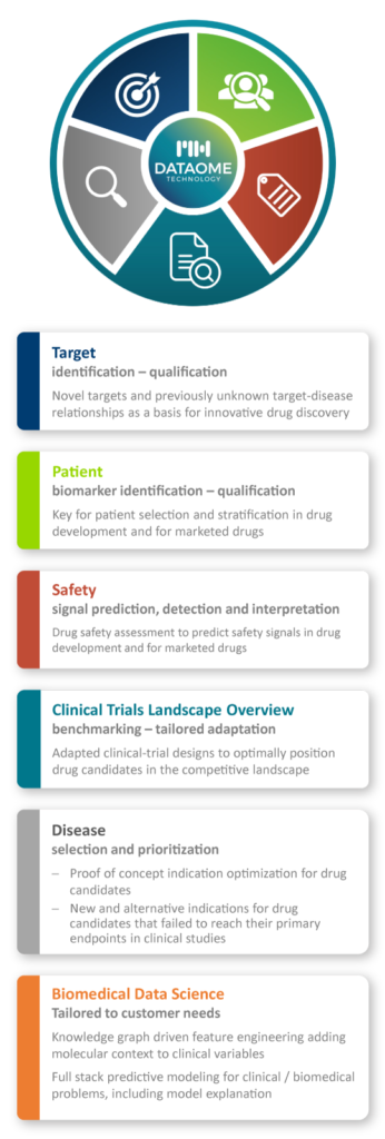 Through proprietary text-mining and integration of data from multiple global sources, Dataome Technology assimilates and structures an unparalleled body of information that is then organized into a highly interconnected knowledgebase of expert-curated quality. Those data can then be interrogated via a unique portfolio of analytical technologies and AI methods.