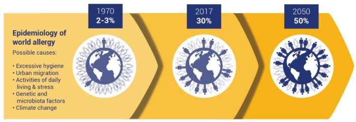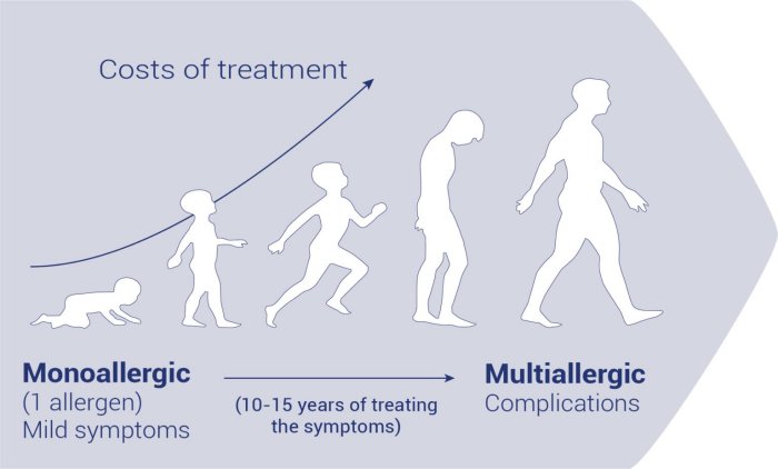 A silent pandemic… Allergy is a chronic progressive disease with serious complications evolving over decades of life. Allergy can be viewed as the result of one’s immune response “stalled” in a pre-natal state, with the “normal”, protective type of immune response failing to kick-in. Genetic, environmental and lifestyle factors play a role in someone becoming allergic. From there, the disease can progress to involve several sources of allergens such as pollens, house dust mites, pet dander and various foods items. Besides the symptoms and their impact on everyday life, it is also lifelong complications that make the search for an effective solution so pressing. Yet, in spite of $30 billion USD spent yearly worldwide, allergy continues its epidemiologic march unchecked…