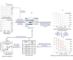 The second step involves identifying deuterated peptides based on the retention time of the un-deuterated peptide and range of possible m/z values. As exposure to deuterium increases, the overlay of individual peptide spectra shows EX2 kinetics, gradually shifting to higher m/z values. In the third step, peaks are picked within the anticipated m/z range and retention time windows, and the average mass of deuterated peptide segments is calculated. The second and third steps are generally completed using software specifically designed for HDX-MS analysis, such as HDExaminer (Sierra Analytics, Modesto, CA) and DynamX (Waters, Milford, MA), along with free or open-source software like HDX-Analyzer, HX-Express, Hydra, and HDX WorkBench. Typically, the information required to process HDX-MS data includes a list of peptides, retention times, and the protein sequence. The results obtained must be scrutinized and curated by experts, generally involving alignment of peptide retention times to better match computed and observed mass spectra and to exclude peptides with overlapping spectra or poor spectral quality. Many peptides excluded during manual data curation can reliably be re-detected in un-deuterated samples. Finally, the mass increase for each peptide segment is plotted according to predefined deuterium exposure times, or a heatmap of deuterium incorporation percentage is displayed using the protein sequence.