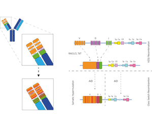 The variability of the variable region primarily promotes the vastness and adaptability of human antibody repertoire that is essential for neutralizing antigens. The antibody repertoire is extensive with 10-10unique antibody sequences. Pro-B cells undergo V(D)J recombination, which diversifies Ig. The variable (V), diversity (D), and joining (J) gene segments come together to form the variable region exon of an Ig, initially expressed as IgM in unmatured B cells. When antigen invades in oragnism, B cells are activated, leading to further diversification of Ig through somatic hypermutation (SHM) and class switch recombination recombination (CSR).