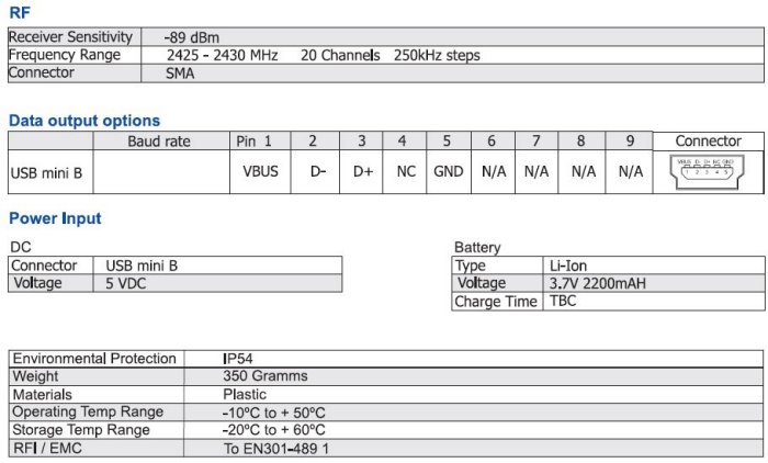 A 9 way D connector is provided to output data via RS232/RS422 and a USB mini B to charge the battery and output data to a PC.