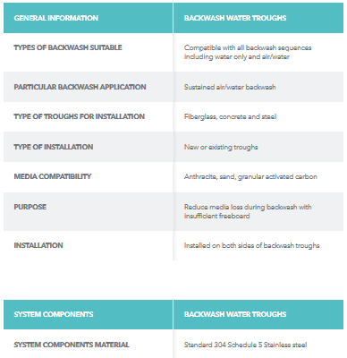 Xylem`s Leopold fiberglass backwash water troughs are used in water and wastewater filters to provide uniform removal of wash water during backwashing. A wide selection of carrying capacities will meet any design requirement. Molded of densely laminated fiberglass-reinforced plastic, Xylem`s troughs are durable, corrosion resistant, reinforced for strength and stiffness, and maintenance free. They are easy and economical to install, with no costly forming work, and all mounting brackets, hardwre, and stabilizers are stainless steel. The optional stainless steel Trough-Guard media retention baffles reduce media loss during a sustained air/water backwash over the wash-water trough weir edge.