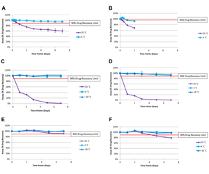 Figure 3. Stability Data for Amoxicillin Sodium (2 mg/mL and 20 mg/mL), Benzylpenicillin Sodium (0.6 mg/mL and 6 mg/mL), and Flucloxacillin Sodium (0.5 mg/mL and 5 mg/mL) [3]