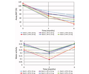 Figure 4. Accelerated Stability Study Results for Drug BHT in HDPE.30 Bottles (Top Image) and Water Activity (Bottom Image) [4]