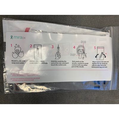The test kit includes an air-tight vial, collection swab, and a biohazard bag, with simple instructions for collecting the sample needed for testing.