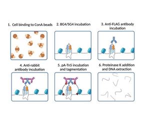 CUT&Tag (Cleavage Under Targets and Tagmentation) is an innovative tool dedicated to DNA-protein interaction research, primarily used to identify transcription factor or histone modification binding sites on a genome-wide scale. The CUT&Tag analysis service utilizes cleavage and transposase tagging technology to precisely map the binding sites of transcription factors or histone modifications within the genome, facilitating research into DNA-protein interaction mechanisms. It provides an accurate solution for genomic and epigenetic studies. Its high sensitivity, low background noise, and exceptional adaptability to low-input samples make it stand out in the field of epigenetics research.