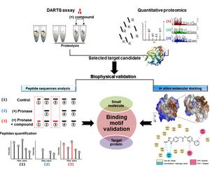In silico molecular docking between SMs and target proteins is a predictive method to determine the preferred orientation of stable complexes. Molecular docking is one of the most practical methods to predict a reasonable binding conformation between bioactive small molecule ligand and binding target proteins. The binding of bioactive small molecule ligand to the protein sites can be described through several high-affinity interactions to determine its most stable structure. These interactions include hydrophobic interactions, electrostatic interactions, and hydrogen bonding interactions. A comprehensive analysis can be performed on stable peptide sequences determined by DARTS and LC-MS/MS, as well as amino acids that directly interact with bioactive SMs determined by in silico molecular docking. These amino acids can provide key binding groups, offering essential information for biological and phenotypic validation mutation studies.