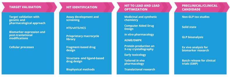 - Full range of in-house drug discovery capabilities including chemistry, in vitro and in vivo pharmacology, ADME, protein production and structural biology, including X-ray crystallography, computational chemistry, pharmacokinetics and toxicology