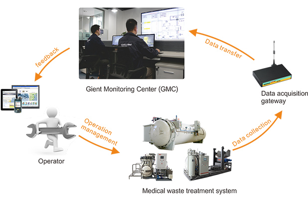 Each Gient medical waste treatment system is equipped with data collector, which could record the operation data and send the data back to GMC timely. GMC is able to pre-estimate and pre-alarm to any abnormalities, so as to provide guidance to the local operators regarding the operation, repair and maintenance etc.