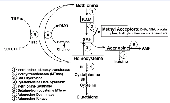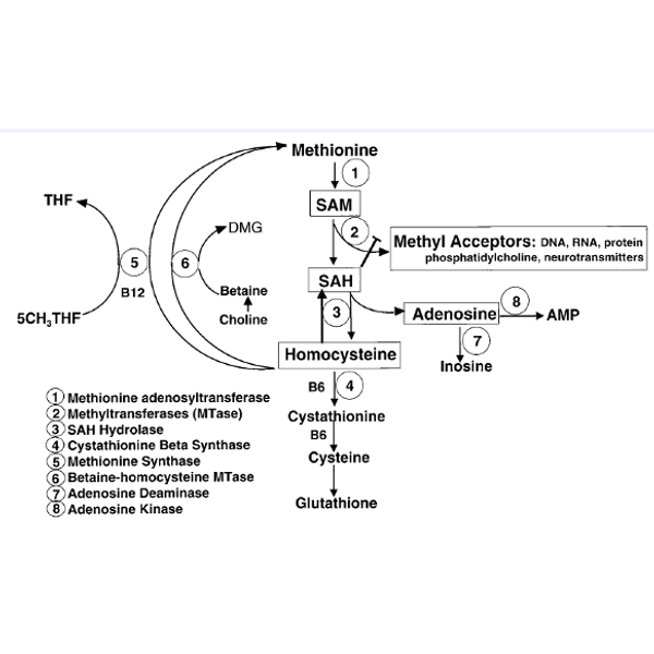 Below is a simple diagram (Melnyk S, Clin. Chem. 2000) that illustrates methionine cycle (a part of one carbon metabolism pathway) that details factors involved in the methylation process. Genetic or nutritional disturbances (e.g. deficiency of folate, Vitamin B12, B6, methionine or choline) that prevent efficient product removal of homocysteine (Hcy) or adenosine will lead to S-adenosylhomocysteine (SAH) accumulcation. Excess SAH and Hcy is thought to readily cross the cell membrance into the plasma. Elevated SAH or Hcy has been associated with increased risk of cardiovascular diseases, colon cancers, birth defects, recurrent pregnancy loss, central nervous system demyelinization and neuropsychiatric disorders. Increased SAH leads to methyltransferase inhibition, which reduces methylation of essential molecules such as DNA, RNA, protein, neurotransmitters, etc. This means methylation index is much reduced in many pathological processes.