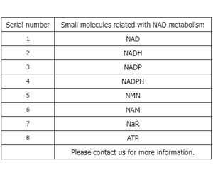 NAD metabolism-related small molecules include oxidized nicotinamide adenine dinucleotide (NAD), reduced nicotinamide adenine dinucleotide (NADH), oxidized nicotinamide adenine dinucleotide phosphate (NADP), reduced nicotinamide adenine dinucleotide phosphate (NADPH), nicotinamide mononucleotide (NMN), nicotinamide (NAM), nicotinamide riboside (NaR), and adenosine triphosphate (ATP). NAD, also known as coenzyme I, is an essential coenzyme in redox processes and participates in various physiological activities such as DNA repair, cellular metabolism, and energy synthesis.+++