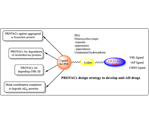 Proteolysis-targeting technology is a new emerging technique to target mutated, denatured, and misfolded proteins that accumulate in various parts of the body. The accumulation of these aggregated harmful proteins, such as β-amyloid (Aβ), tau, mHTT, polyglutamates, and other proteins in the brain, are some of the reasons for the development of neurodegenerative diseases. Aβ accumulation and hyperphosphorylation are the common signals for the progression of Alzheimer’s disease (AD). The challenge of targeting these proteins with traditional small-molecule inhibitors due to their undruggable nature has been significant. However, the body’s inherent protein quality control systems, which remove these aggregates, represent a natural defense mechanism. Advances in medicinal chemistry have led to the development of targeted protein degradation technologies that leverage the UPS to dissolve/degrade misfolded proteins implicated in diseases, offering a new avenue for therapeutic intervention in conditions like AD.