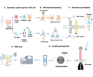 Engineered T cells with TCRs targeting a wide array of tumor antigens have shown promising results in solid tumor therapies. However, identifying functionally specific TCRs is both time-intensive and costly. A new antigen-TCR screening platform, leveraging droplet microfluidics, enables efficient high-throughput screening of pMHC-TCR interactions with heightened sensitivity and minimal background noise. Incorporating DNA barcoding for antigen-presenting and Jurkat reporter cells facilitates specificity assessments of pMHC-TCR interactions, with next-generation sequencing (NGS) offering detailed insights into peptide-MHC-TCR recognition dynamics. This innovative approach promises to streamline the identification of clinically relevant TCRs, enhancing the precision of TCR-T cell therapies.