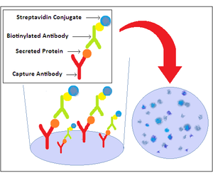 Recognized for its sensitivity within cellular immunology, the ELISpot assay facilitates detection of both antibody-secreting (B cells) and cytokine-secreting (T cells) at the single-cell level. Capable of identifying a single secreting cell amongst 200,000 to 300,000 cells, this assay triggers immune cell activation in the presence of stimulants. Secretions are captured by specific monoclonal antibodies (mAbs) affixed to the ELISpot plate's PVDF membrane. Following cell removal, captured cytokines bind to biotin-labeled mAbs, then to enzyme-linked avidin, and develop color upon substrate addition. Resultant spots signify cytokine production, quantified through an ELISpot Reader.