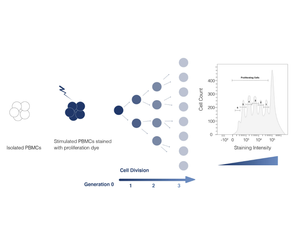Flow cytometry serves as a standard for tracking cell proliferation, utilizing dyes like CFSE and PKH26 to mark living cells. These dyes dilute upon cell division, allowing subsequent generations to be distinguished by fluorescence intensity reduction. Peptide libraries tailored to experimental needs are synthesized, with donor PBMCs tagged using CFSE. Co-culturing with peptides elicits CD4+ T cell proliferation, observable through CFSE dilution and analyzed via flow cytometry to gauge antigen response.