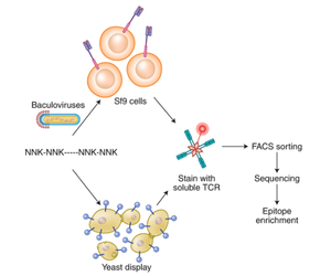 Peptides can also be engineered genetically and presented on the surfaces of bacterial, yeast, or mammalian cells as part of pMHC complexes. A significant advantage of using yeast display is its ability to initiate with a vast, truly diverse library of billions of pMHC complexes, eliminating the need for prior epitope knowledge. Its primary challenge lies in the necessity to modify MHC alleles to improve folding, stability, and pMHC presentation adequately. Unlike yeast display, phage display does not require these modifications. Despite yeast display predominantly generating mimotopes, recent advances in algorithms have substantially enhanced the mapping of these mimotopes to their corresponding natural peptides. A common limitation of both yeast and phage display techniques is the requirement for generating soluble TCRs, a process known for its instability. These display techniques involve presenting a peptide library within Sf9 insect or yeast cells, staining with fluorescently labeled soluble TCRs, followed by FACS sorting of the labeled target cells for sequencing and epitope determination. The NNK codon scheme is employed, representing degenerate codons where "N" stands for any nucleotide, and "K" represents either guanine (G) or thymine (T).