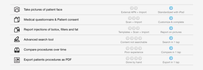 Based on a study of the overall activity around injections, we estimate the time saving to be at least 10 min per patients with iRejuvenation, compared to a standard paper and pencil reporting. In each actions, iRejuvenation is faster and better than paper and pencil. Look at the comparison table below to be convinced.