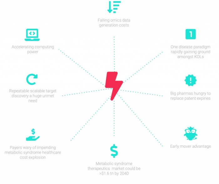 MultiOmic’s process begins with the collection of biological samples along with clinical and outcome data, Multi-omics data is derived from these samples, Raw data from the vendors is pooled into a central data lake, The data lake is used to build artificial intelligence (AI)-enabled computational system biology models that are fine-tuned with wet lab experimentation, The model is utilized to identify endotypes, causal pathways and precision therapeutics.