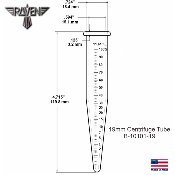 Durable and Reusable Centrifuge Tubes. Conical bottom centrifuge tubes with graduated scale in 0.2% -100% allow very small amounts of solids compacted in the bottom to be measured. Made of durable polycarbonate. The shoulder at the top of the tube hangs in the rotor trunnion rings. These polycarbonate tubes cannot be used with flammables, solvents, or cooking oils. The 19mm tubes are recommended for Raven`s model F-10300 centrifuge. Please verify diameter prior to using in other manufacturers` centrifuges. Sold in packs of 12 tubes.