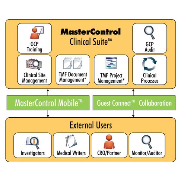 The MasterControl Clinical Suiteā¢, a clinical management software system, is designed to manage all of the documents, tasks, processes, relationships, audits, and training that must be administered and controlled throughout the life of a clinical trial. The MasterControl Clinical Suite is a complete clinical management software solution designed to increase efficiency and reuse of information while streamlining the processes and tasks that must be executed during the length of a clinical trial.