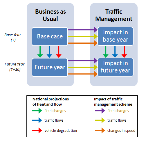 - Future year: Predicting changes in future emissions due to national trends in traffic flows and fleet composition in a "business as usual" scenario without traffic management.