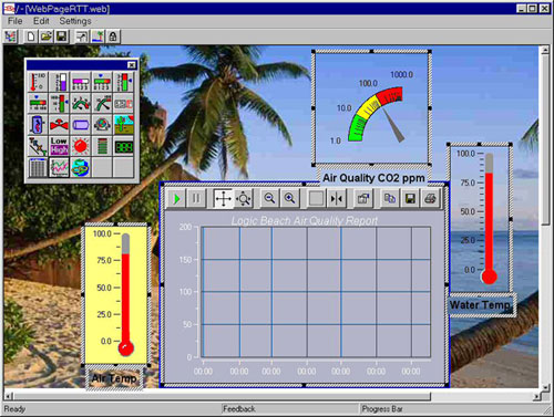 A few of the objects available include thermometers, angular gages, tanks (level), digital displays, counters and more. These objects can be used for both the custom web pages and real-time trending via HyperWare-II. Logic Beach has created it`s own Web Browser, GreenWater (TM) available free here, which speeds data presentation by preloading the graphic objects to your PC and just downloaded object type, place and value from the data logger being viewed.