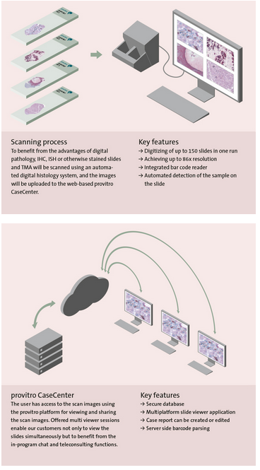 The evolving digital pathology offers new and fast solutions in evaluating and analyzing tissues. The provitro CaseCenter meets all requirements to manage scanned slide images and to provide access to them accordingly. Images can be viewed and annotated by multiple persons simultaneously, which also enables teleconsultations with our provitro-associated pathologists.