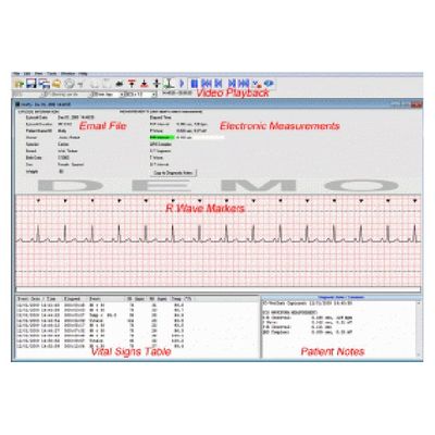 All Vmed wireless monitors include the bonus Reviewer program which allows saved files to be recalled and analyzed. Video controls allow replay of the entire monitoring session from beginning to end. Raw data files can be emailed for review by consulting cardiologists directly from the saved file (NOTE: Your consultant must download the Reviewer program at no charge from Downloads/Support). Files may also be sent in PDF format by email or FAX using a 30 second image of ECG and Capnogram wave forms and the entire vital signs record.
