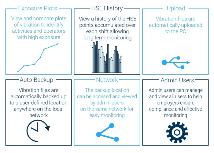 At the end of a shift the user simply replaces the dosimeter into the docking station and the software will automatically download the vibration file and assign it to the user. The operator is also able to view their own files including; individual vibration profiles over a shift or a comparison of cumulative HSE points acquired. These file review features are powerful tools that allow users to ensure they are below exposure limits as well as providing the ability to identify which activities cause the most exposure.