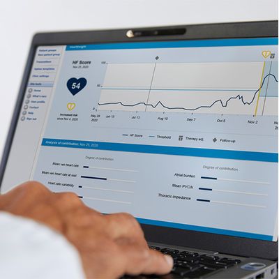HeartInsight is a premium remote heart failure management solution that identifies patients at higher risk of decompensation early on. HeartInsight predicts heart failure hospitalizations – automatically and with high sensitivity – by combining multiple parameters into a single composite score, leading to one actionable alert. Industrywide it has the lowest false-alert rate and provides the earliest notifications of silent clinical changes that may lead to heart failure hospitalizations.4,5