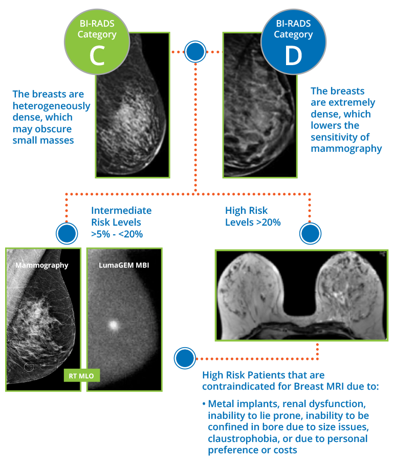 For the small minority of dense breast women whose risk factors place them at greater than 20% lifetime cancer risk (i.e., BRCA gene mutation, first degree relative with breast cancer, etc.), MRI is generally indicated. For those patients who have a 20% or greater lifetime risk, but are contraindicated and/or cannot tolerate an MRI, MBI also offers a solution for early breast cancer detection and imaging in patients with dense breast tissue.