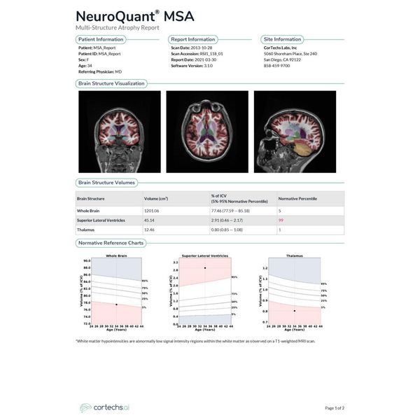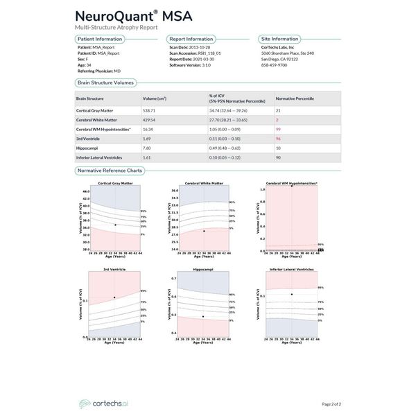 For the assessment of brain volumes for multiple sclerosis and age-associated neurodegenerative conditions. The NeuroQuant Multi-Structure Atrophy Report presents volumetric information for whole brain, superior lateral ventricles, thalamus, cortical gray matter, cerebral white matter, cerebral white matter hypointensities, 3d ventricle, hippocampus, and inferior lateral ventricles. The MSA report supports physicians in their assessment of patients aged 3-100.