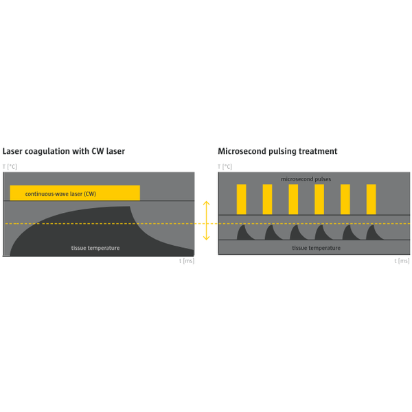 Laser energy is applied in a series of brief pulses in the range of 100–300 μs with the aim of repeatedly heating retinal tissue.