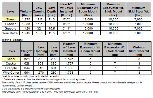 This scrap shear, the Genesis Versi Pro 07 with Shear Jaw, features a modular design and quick-change jaw sets that enable contractors in a broad range of applications to get bigger results from their smaller machines. Interior demolition, scrap processing, and on-site material processing and handling. All with one versatile tool.