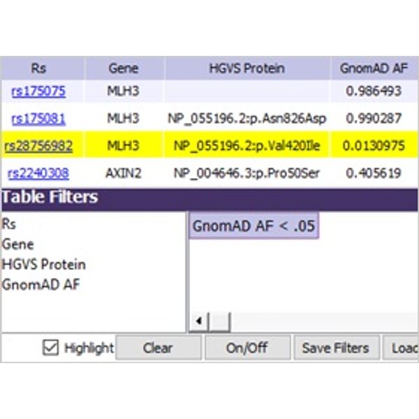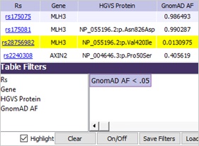 Filtering: The sample’s variants have been set to highlight only variants with GnomAD allele frequency of less than 0.05. Deselecting the Highlight option would display only those variants that match the filter.