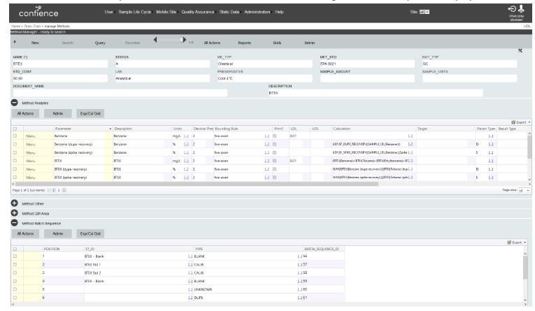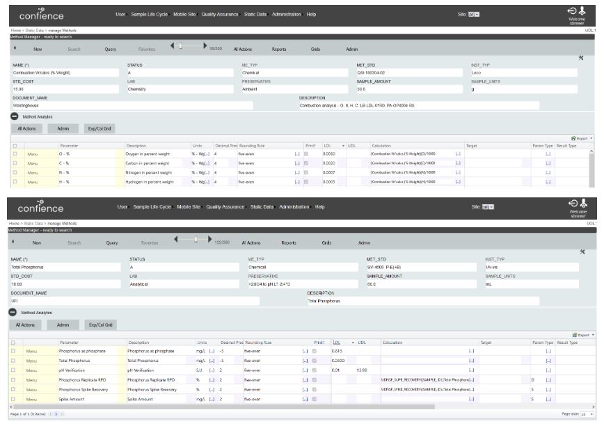 The Confience eLIMS QA/QC option enables users to set up templates for automatic insertion and recording of quality control items such as blanks, spikes, duplicates and standards. This tool is used when it is is essential that all analyses that are performed are organized within analytical batches that group series of samples together. These analytical batches are uniquely identified and associated with the instrument used to acquire the data. Within the batch, the positions at which all calibration, control, quality assurance and unknown samples are recorded and results are time and date stamped to provide a complete audit trail for analytical batches. The quality data is automatically associated with the selected instrument to provide continuous control charting for all analytical equipment.