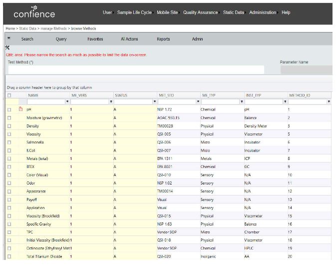 When laboratories assign their work to analysts by test method, the Confience eLIMS Results Entry by Method function may be used. This function permits a user to select a specific test method and be instantly presented with a spreadsheet-like form that contains all samples for which results for the selected test have not been entered. Users are then able to enter results for a large number of samples in an efficient manner.