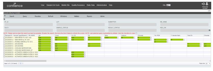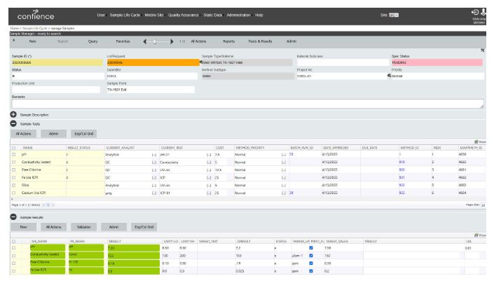 Within some laboratories it is convenient to view all of the sample information while entering analytical results. Laboratories use this mode of results entry when it is beneficial to have a full perspective of the sample being tested at the time of results entry. Confience eLIMS provides a mode of results entry whereby the user may select a single sample using one or more of its descriptive identifiers. When the sample is selected, a listing of all of the required results will be presented for data review and entry.