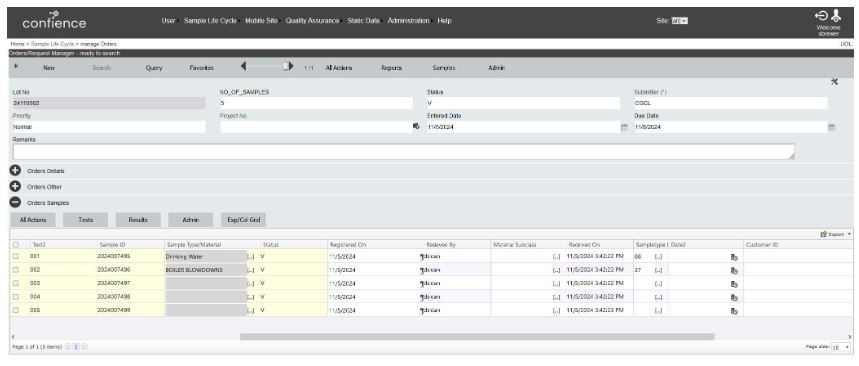 Confirmation of sample receipt is essential whenever samples are logged into Confience eLIMS by users who are not physically located within the laboratory or when samples are automatically logged in via automatic schedule or MRP/ERP interface. When this occurs, Confience eLIMS will record when the lab receives the samples since testing cannot begin until the lab actually has the samples in-hand. The sample receipt function enables the laboratory to record when the sample was received and by whom. This information may be used to calculate laboratory turnaround times within management reports.