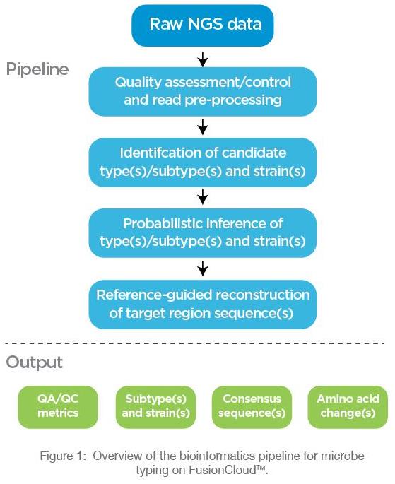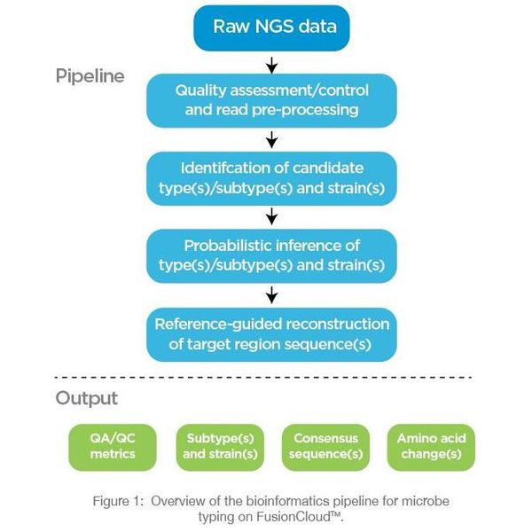 FUSIONCloud analysis software is based on a fully annotated proprietary database developed at FUSION GENOMICS. It contains over 1 million known infectious disease genomes plus some rare pathogen genomes. Its bioinformatics and machine learning tools use pattern matching and statistical rankings which expedites analysis of sequencing data for pathogen identification when compared to simple BLAST based homology. FUSIONCloud is able to infer the type, subtype and strain of the pathogen in question.