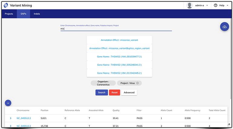 - With "Advanced Search", you can search by giving genomic location interval (For e.g. 10,000 - 30,000) to retrieve SNPs and Indels in that specific interval.